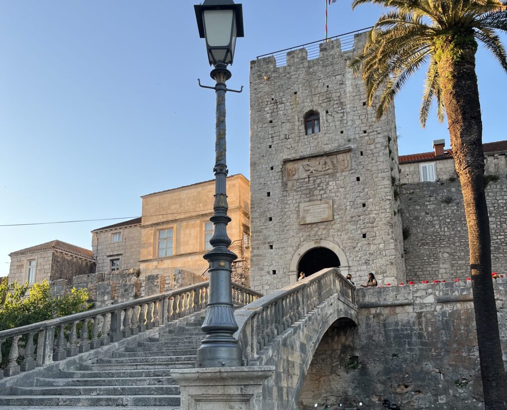 Paseo por Korčula Town. Recorrimos las calles del casco antiguo, que tienen un diseño único de «espina de pez» (diseñadas así para que el viento circule pero no moleste). Es un laberinto de piedra precioso donde cada rincón tiene una foto. Para que no te pierdas ningún rincón, sus leyendas o las mejores vistas desde sus torres, aquí tienes nuestro post detallado para descubrir Korčula Town a fondo: KORČULA, la joya del Adriático para recorrer sin prisas