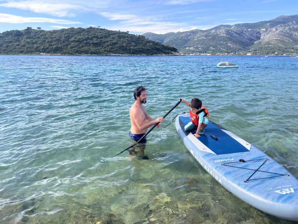 Padel Surf en Vrbovica: De vuelta a nuestra zona, aprovechamos la tabla de paddel surf que nos prestó la dueña del alojamiento. El mar aquí es como una balsa, perfecto para remar en familia. Este es uno de esos planes que hacen que el viaje sea inolvidable. Si quieres saber donde está y cómo alquilar una tabla lee el post Paddle surf en familia por Vrbovica