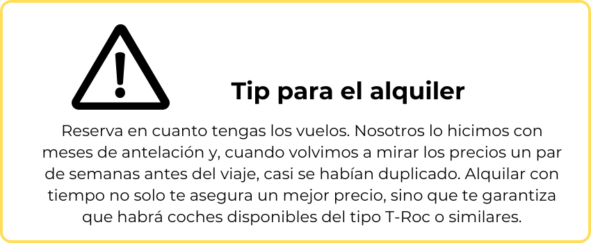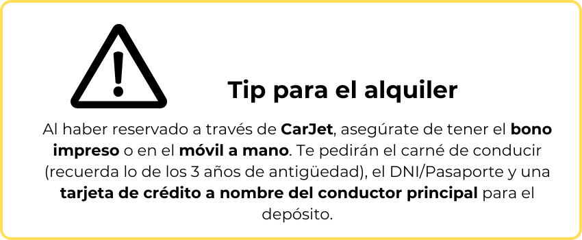 Nota Importante»: «Asegúrate de que la tarjeta de crédito tenga límite suficiente para el bloqueo de la fianza. En nuestro caso, al ser un trayecto One Way (devolución en otra ciudad), el papeleo fue rápido, pero siempre es mejor ir con tiempo».