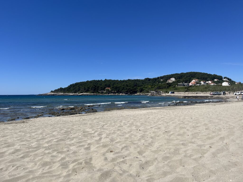 Playa de arena fina y dorada (algo poco común en KORČULA), perfecta para familias y amantes del sol, con aguas poco profundas y cristalinas que invitan a nadar y relajarse, rodeada de viñedos y pinos que le dan un encanto natural único.