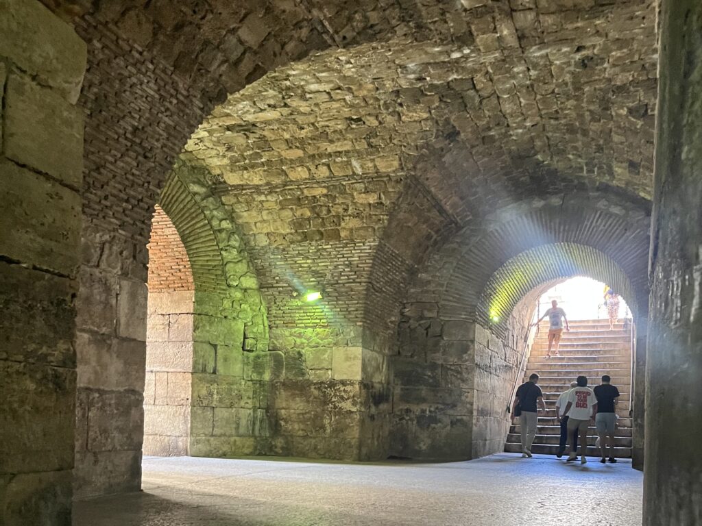 - Los Sótanos del palacio: No es una visita larga, pero sí muy impactante. No son simplemente “unas ruinas bajo tierra”: son la base estructural del antiguo palacio romano y se conservan de forma espectacular. Lo interesante es que reproducen casi exactamente la distribución de la planta superior donde vivía el emperador. Son espacios amplios, con bóvedas de piedra enormes, pasillos largos y una atmósfera que impresiona. Aquí se entiende realmente la magnitud de la construcción romana. A los niños les flipa.